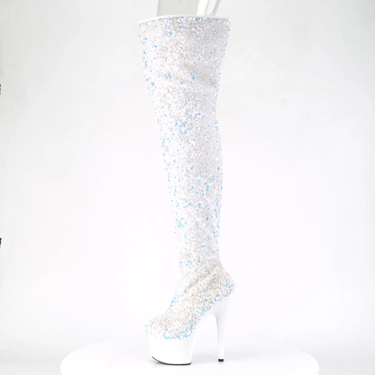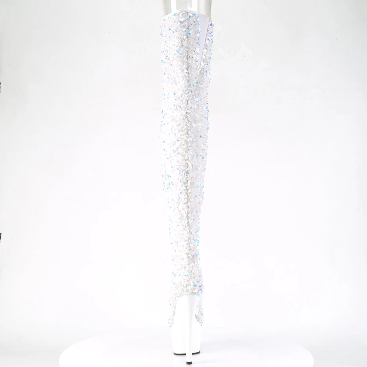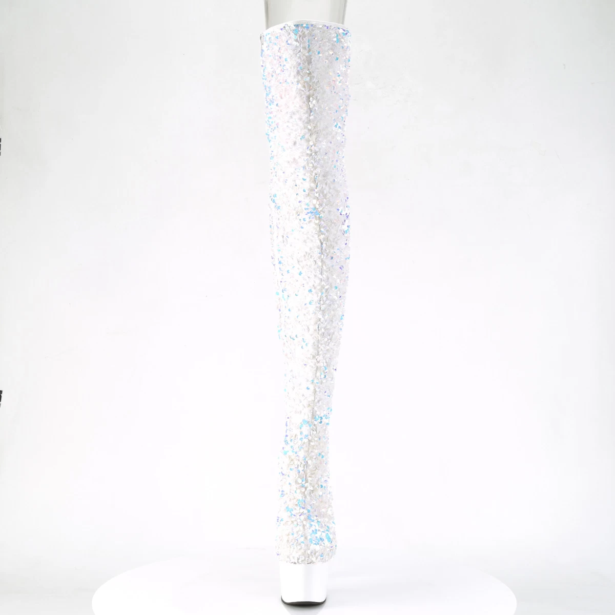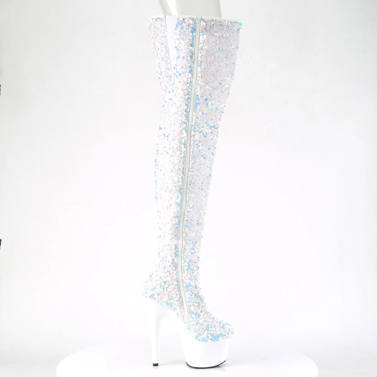 ADORE-3020 White Multi Sequins/White 7″ Heel, 2 3/4″ PF Sequin Thigh High Boot, Inside Zip
