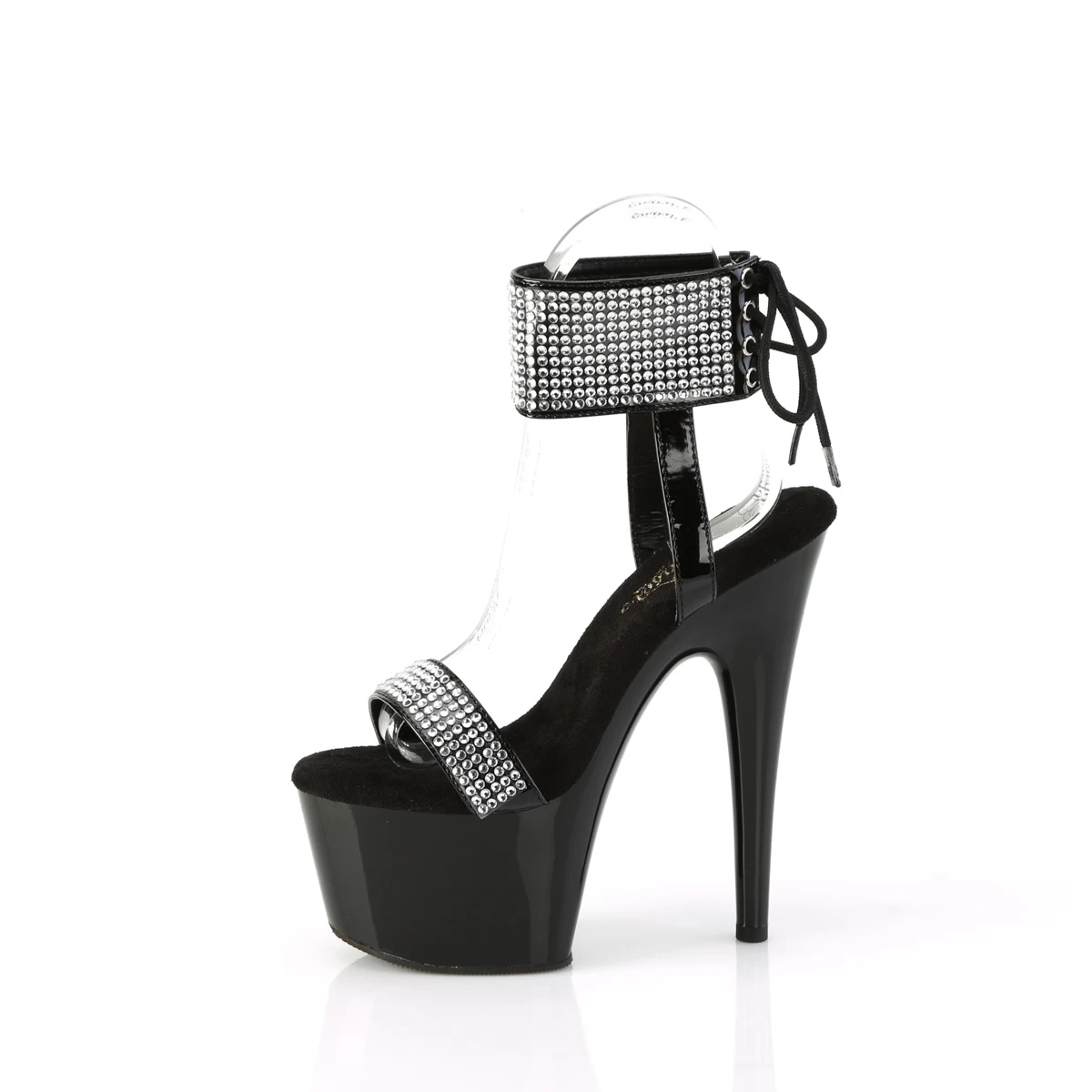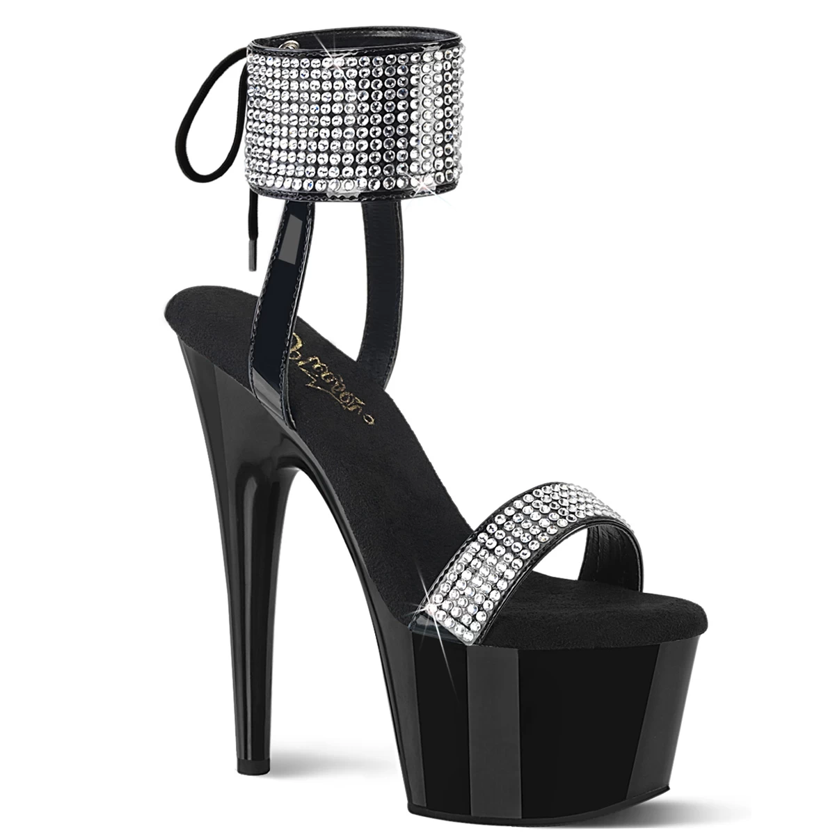 ADORE-770 Black Patent-RS/Black, 7″ – 7 1/2″ Heel, 7″ (178mm) Heel, 2 3/4″ (70mm) Platform Lace-Up Back Sandal Featuring Rhinestones All Over Ankle Cuff & Toe Strap