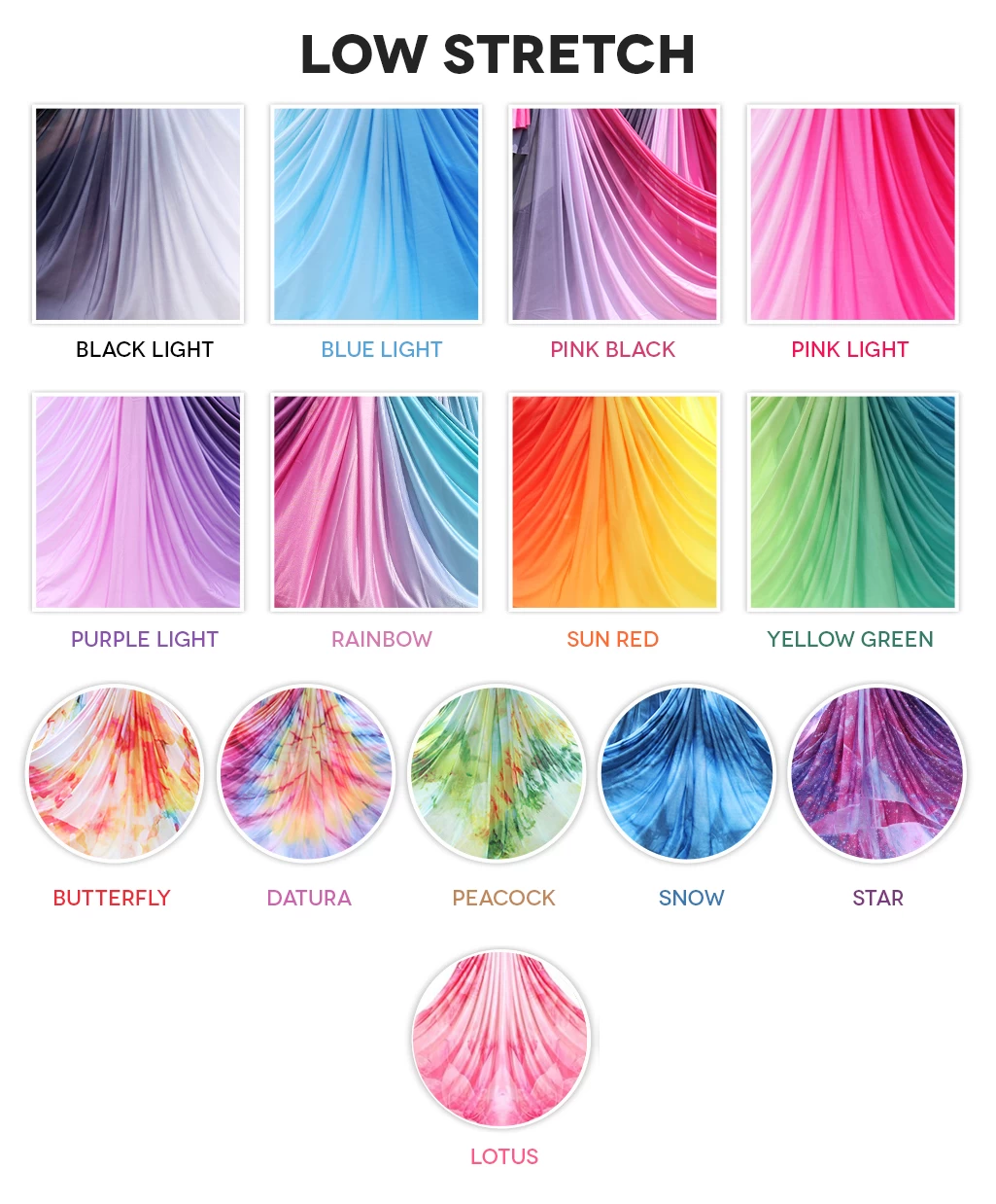 Our Aerial Silks Fabric is available in a beautiful range colours and made from 40 Denier High Strength Nylon Tricot of the best quality.