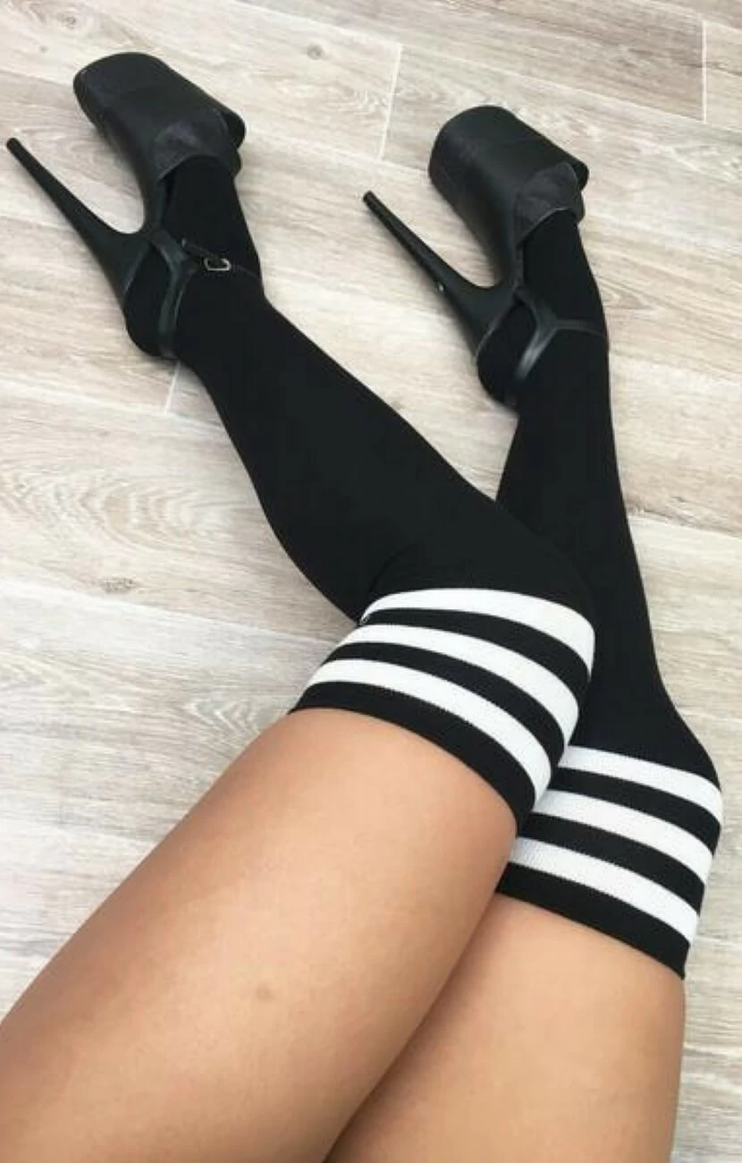 Sport luxe look stretch cotton knit thigh high socks. Perfect look worn with heels for that floorwerk!