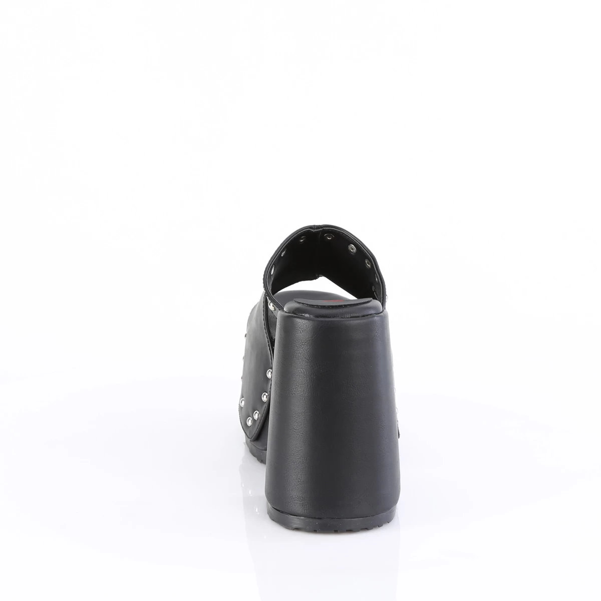 CAMEL-109 Black Vegan Leather, 5″ (12.7cm) Chunky Heel, 3″ (7.6cm) Platform Slide Featuring Silver Chrome Plated Round Studs
