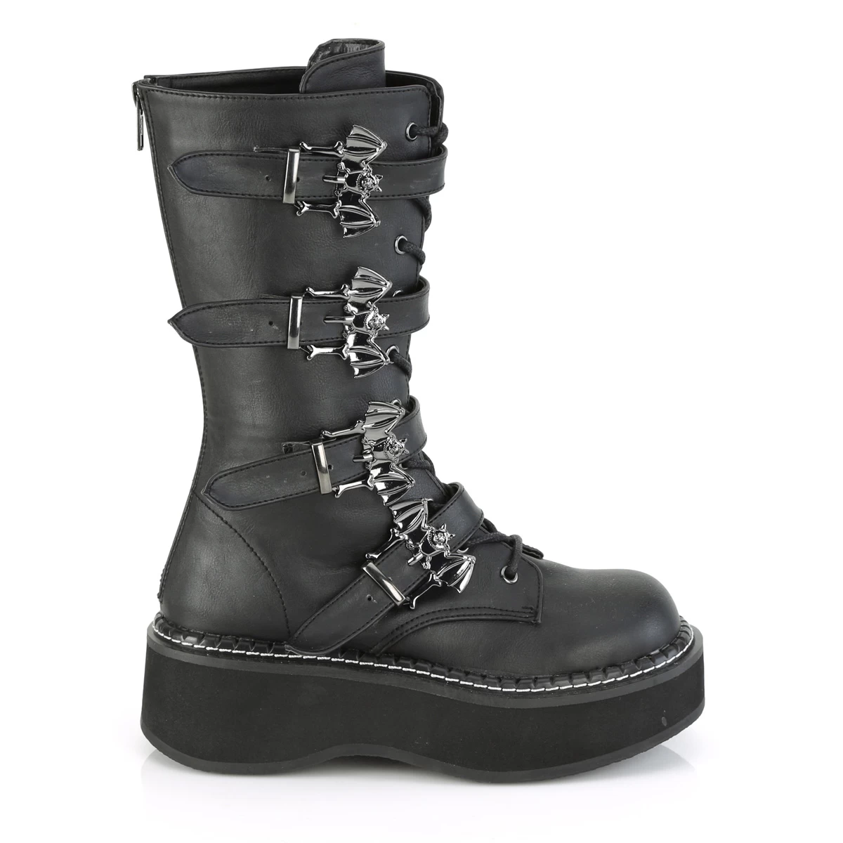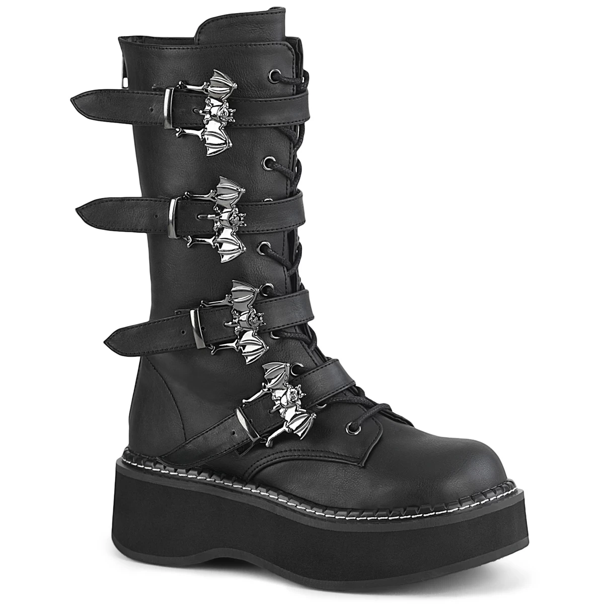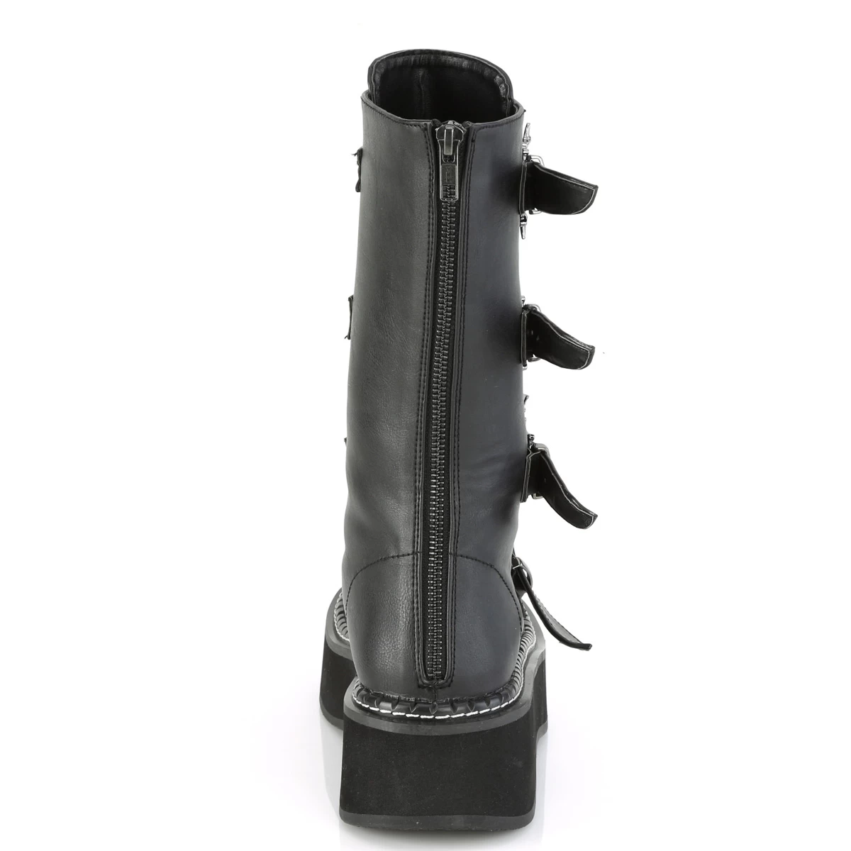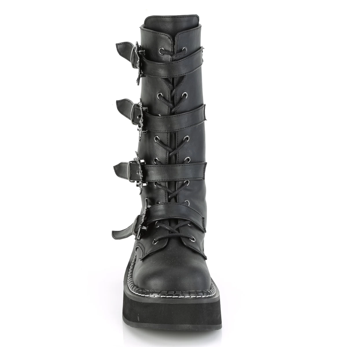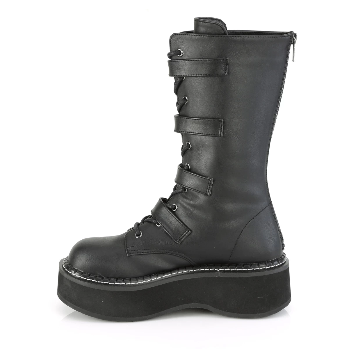 EMILY-322 Black Vegan Leather 2″ PF Lace_up Mid-Calf Boot w/ 4 Buckle Straps, Back Zip