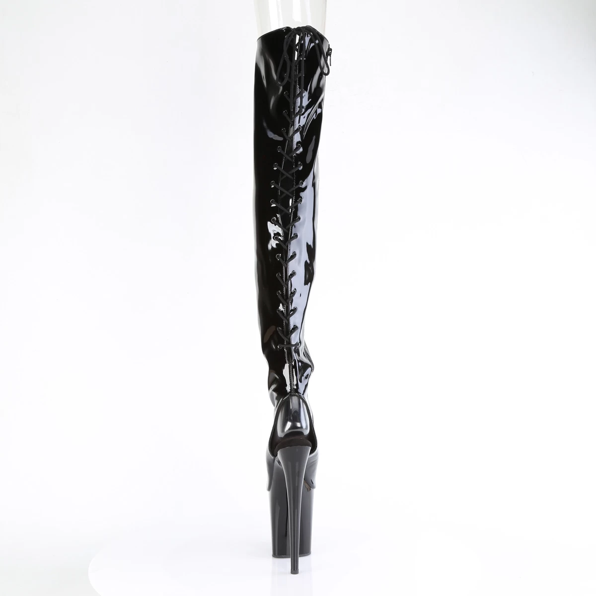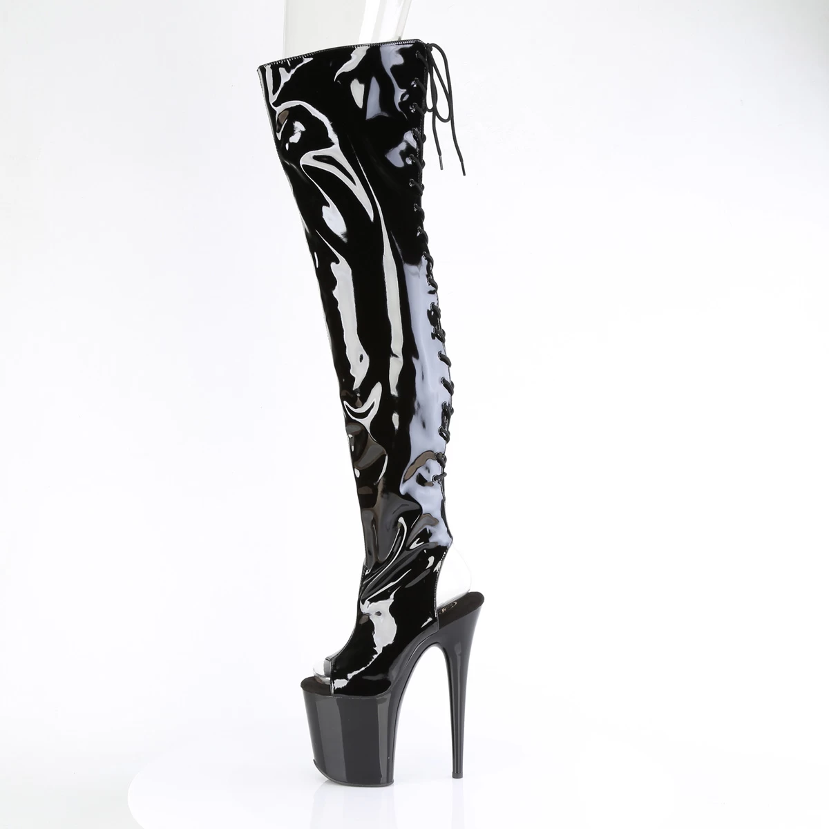 FLAMINGO-3017 Black Stretch Patent/Black, Thigh High Boots, 8″ (200mm) Heel, 4″ (100mm) Platform Open Toe/Heel Lace Up Back Stretch Thigh High Boot, Full Inner Side Zip Closure