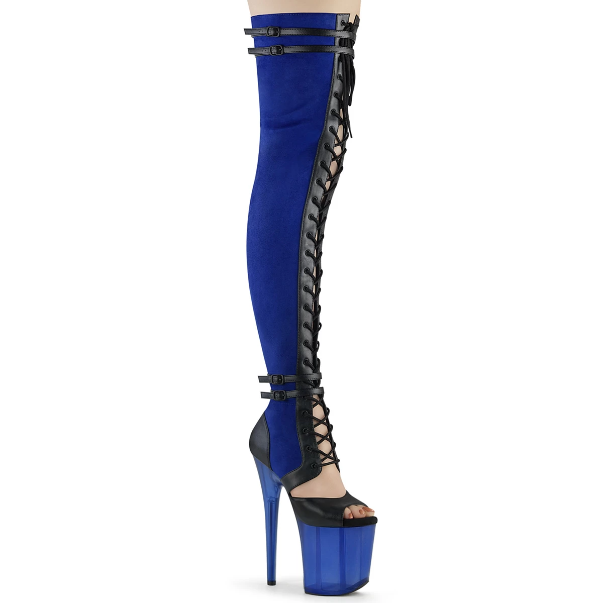 FLAMINGO-3027 Blue Faux Suede-Black Faux Leather/Frosted Blue, Thigh High Boots