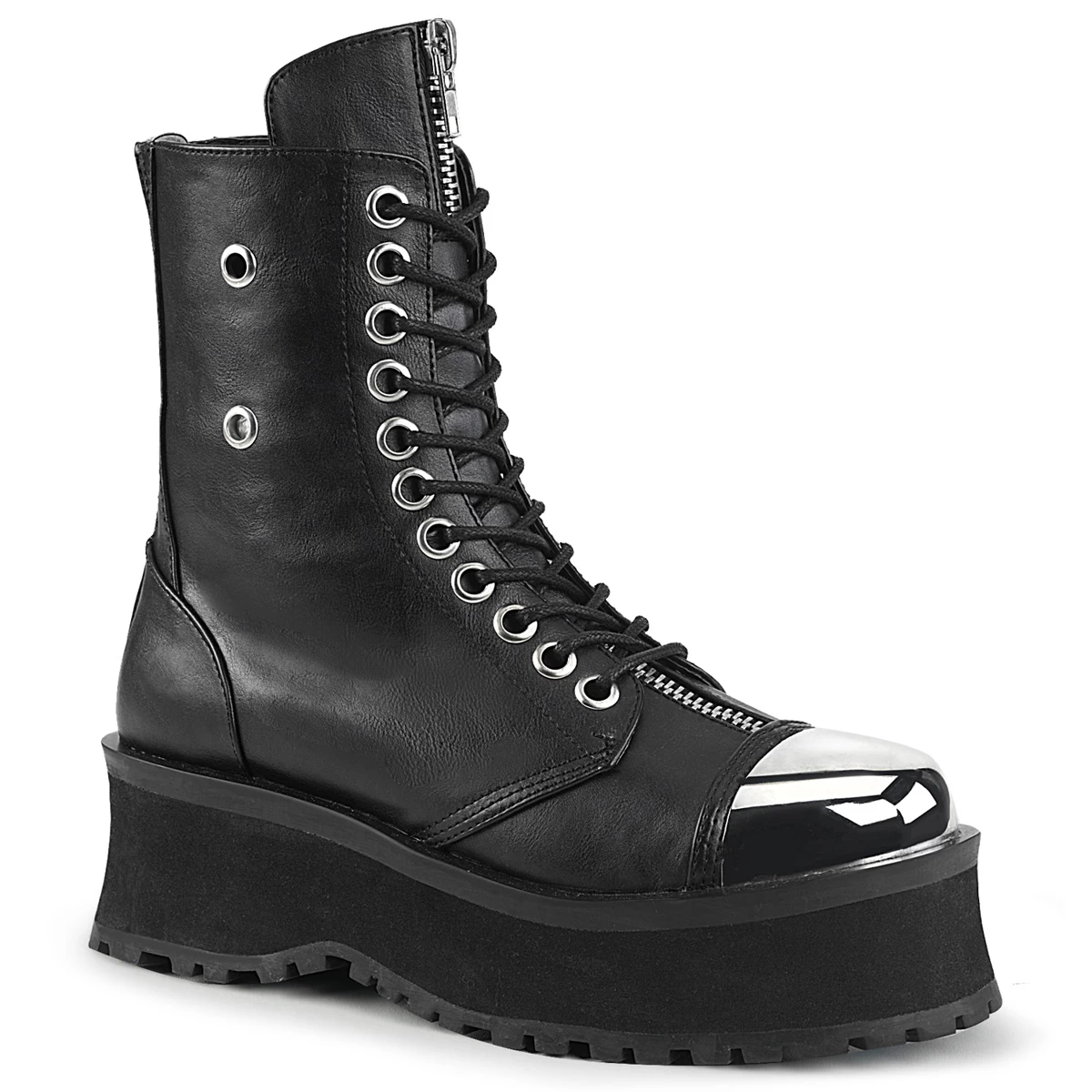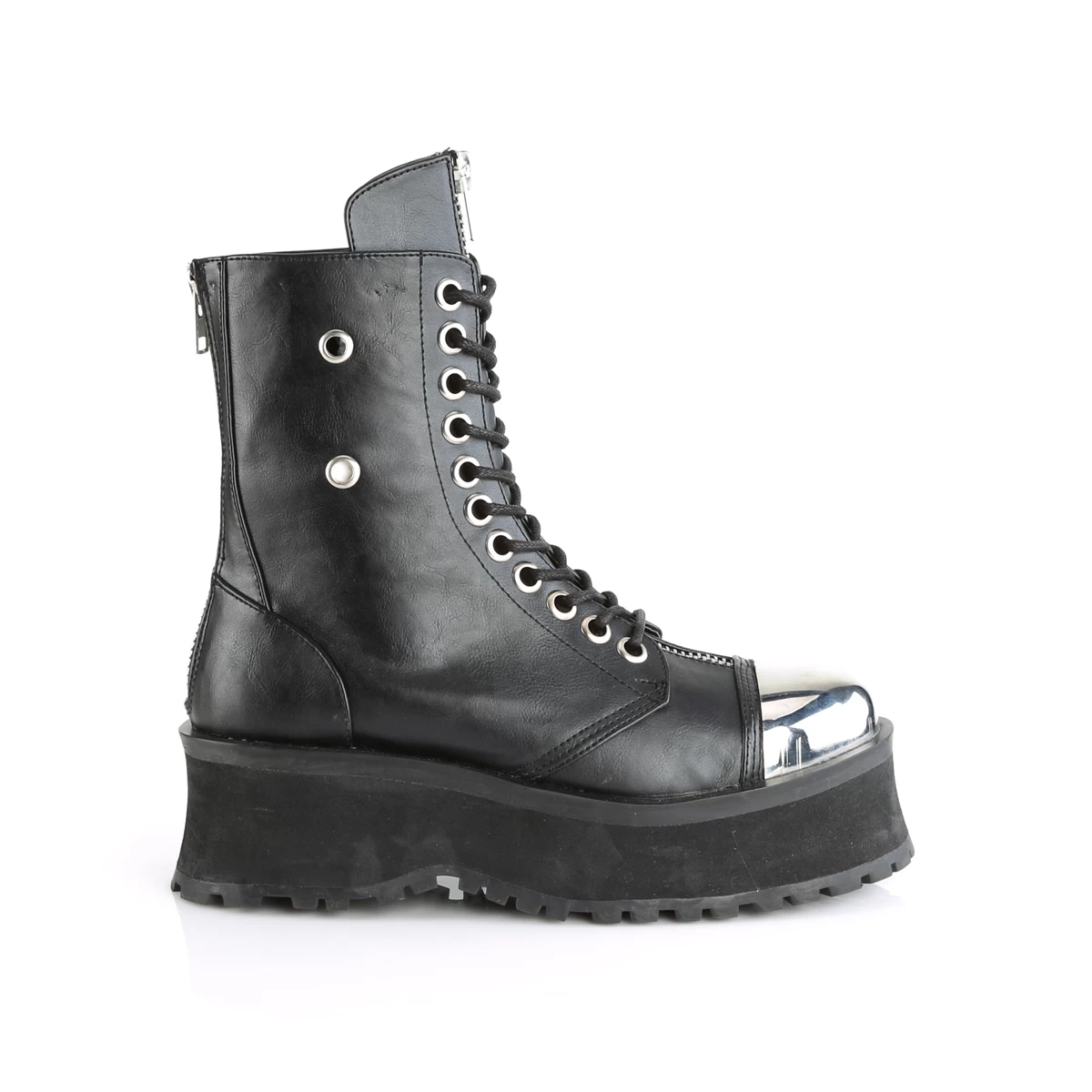 2 3/4″” Platform Lace-Up Ankle Boot W/ Silver Chrome Plated Metal Toe Cap & Zipper Details, Metal Back Zip Closure