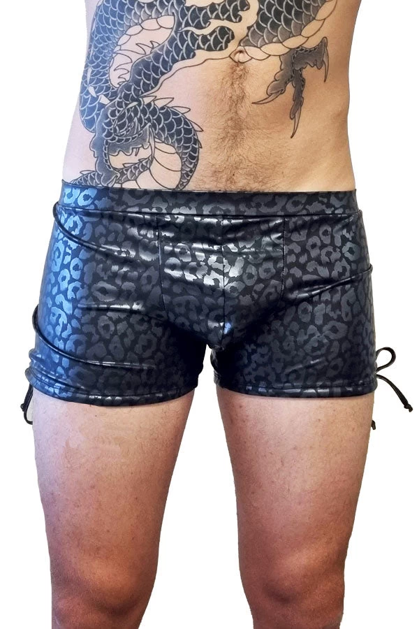 - Black stretch wet look fabric with a leopard print overlay