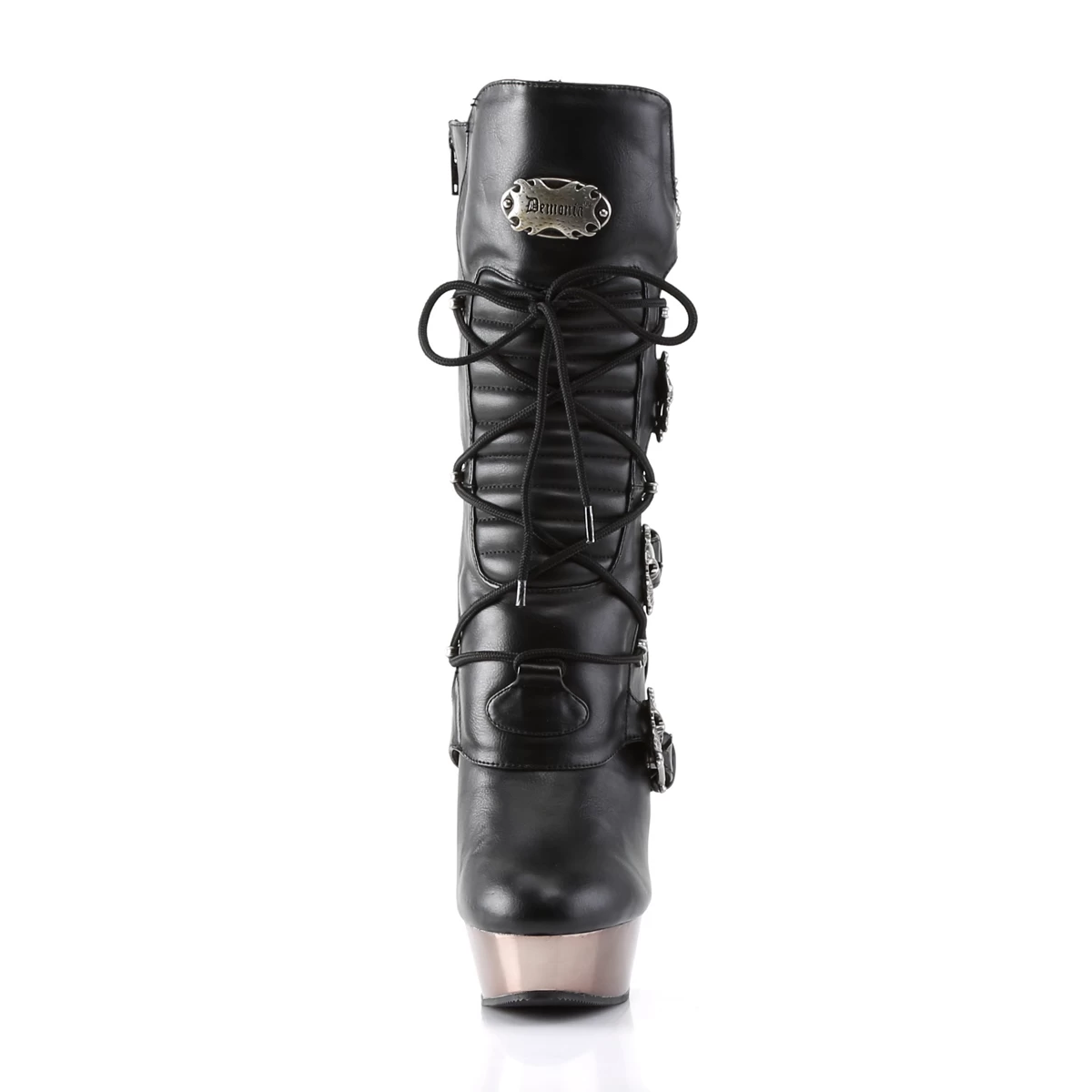 5 1/2″” (14cm) Finger Bone Heel, 1 1/2″” (3.8cm) Platform Lace Up Calf High Boot Featuring Skull Buckle Straps, Side Zip