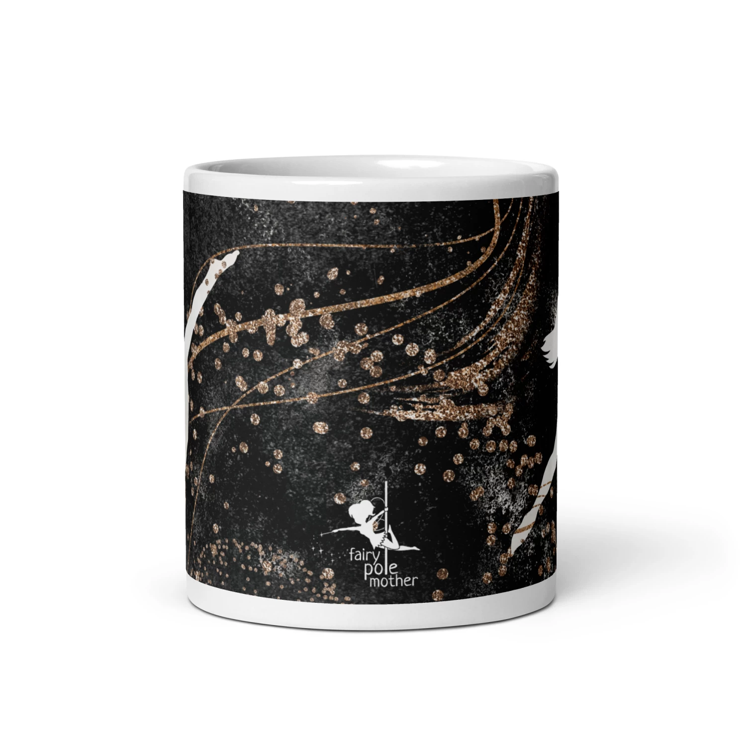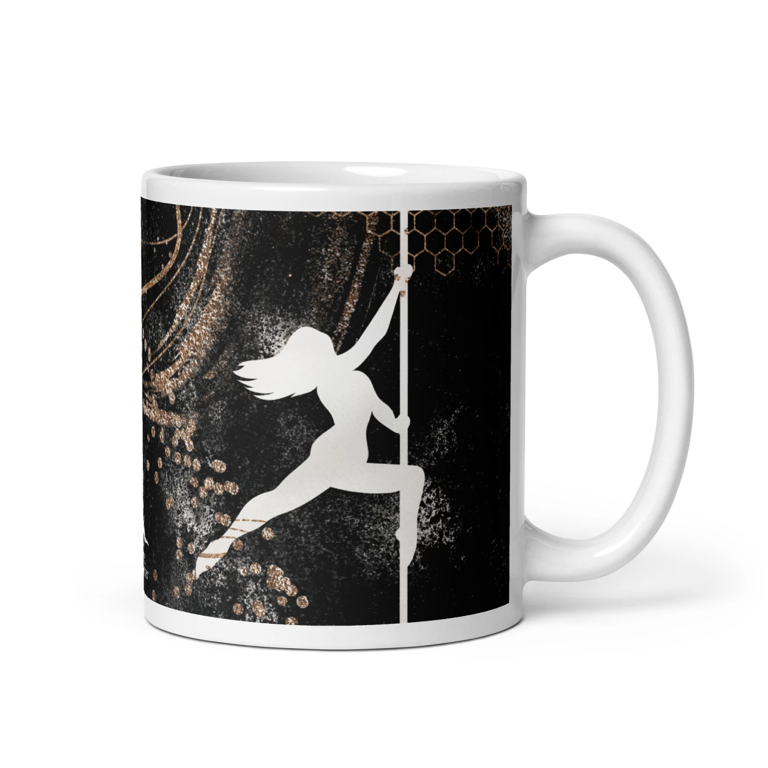 Glossy mug with a rose gold and black pole dancer print.