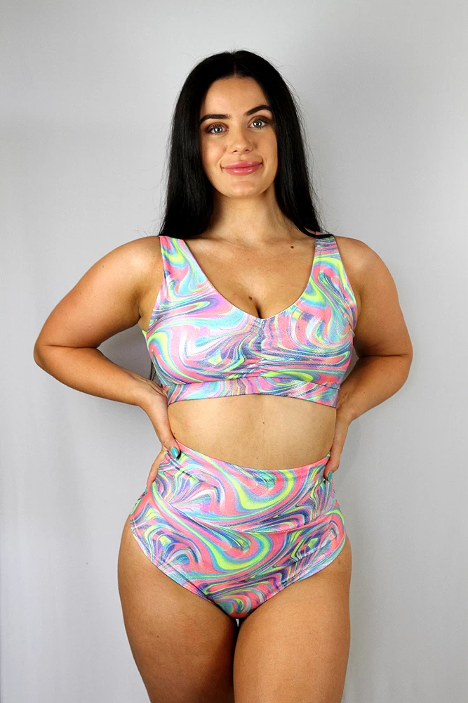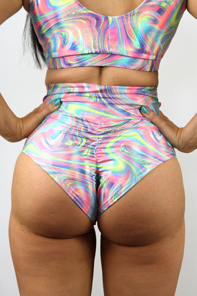 Super high and Super sexy!! This short has it all with its super high waistband it gives a feminine shape to the body, super supportive on the belly and very flattering on the booty. Available in lots of sparkles and prints, this short is a must in any pole dancers wardrobe or a festival goer that wants to stand out!