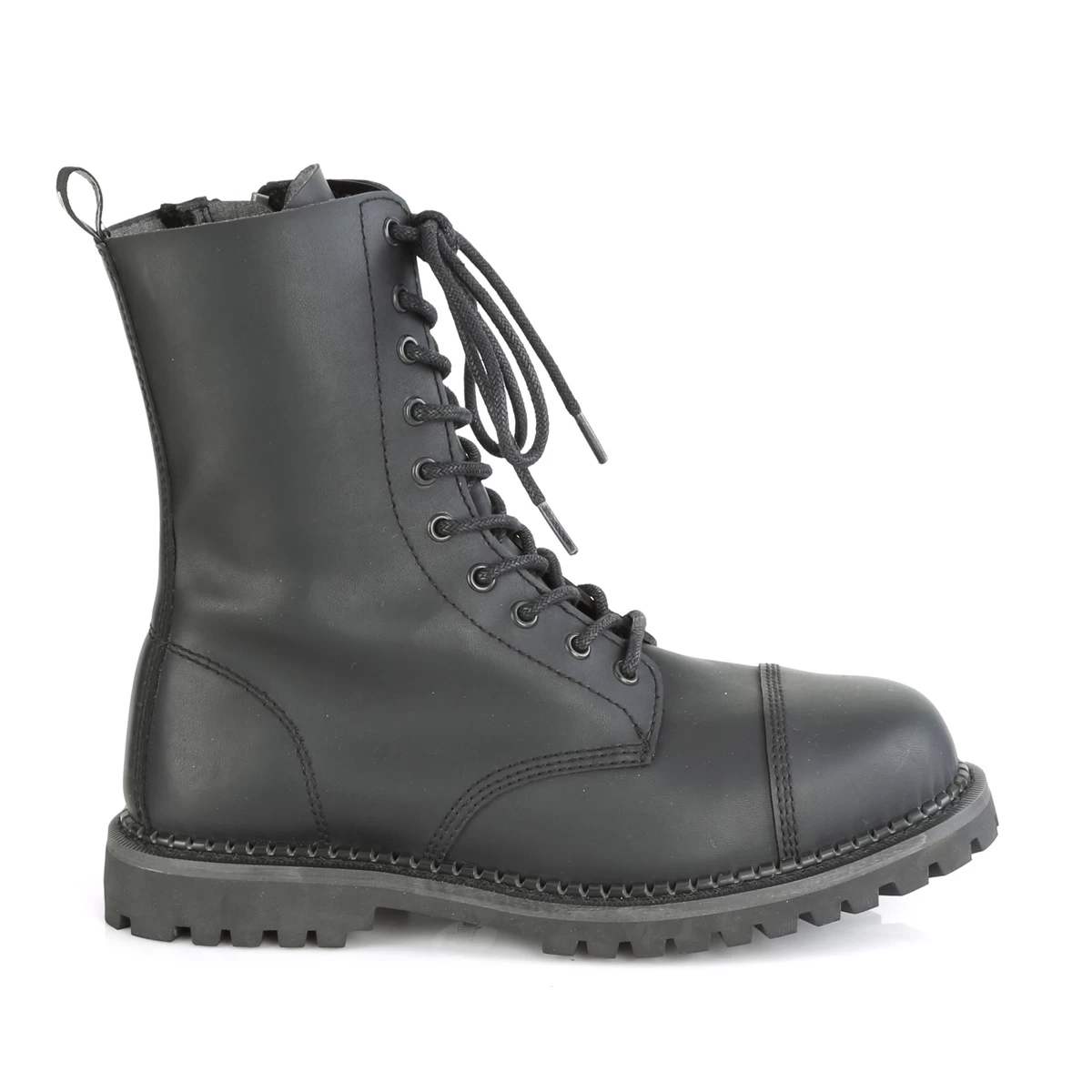 Demonia 10 Eyelet Unisex Vegan Steel Toe Lace-Up Ankle Boot, Rubber Sole, Full Length Inside Zip Closure