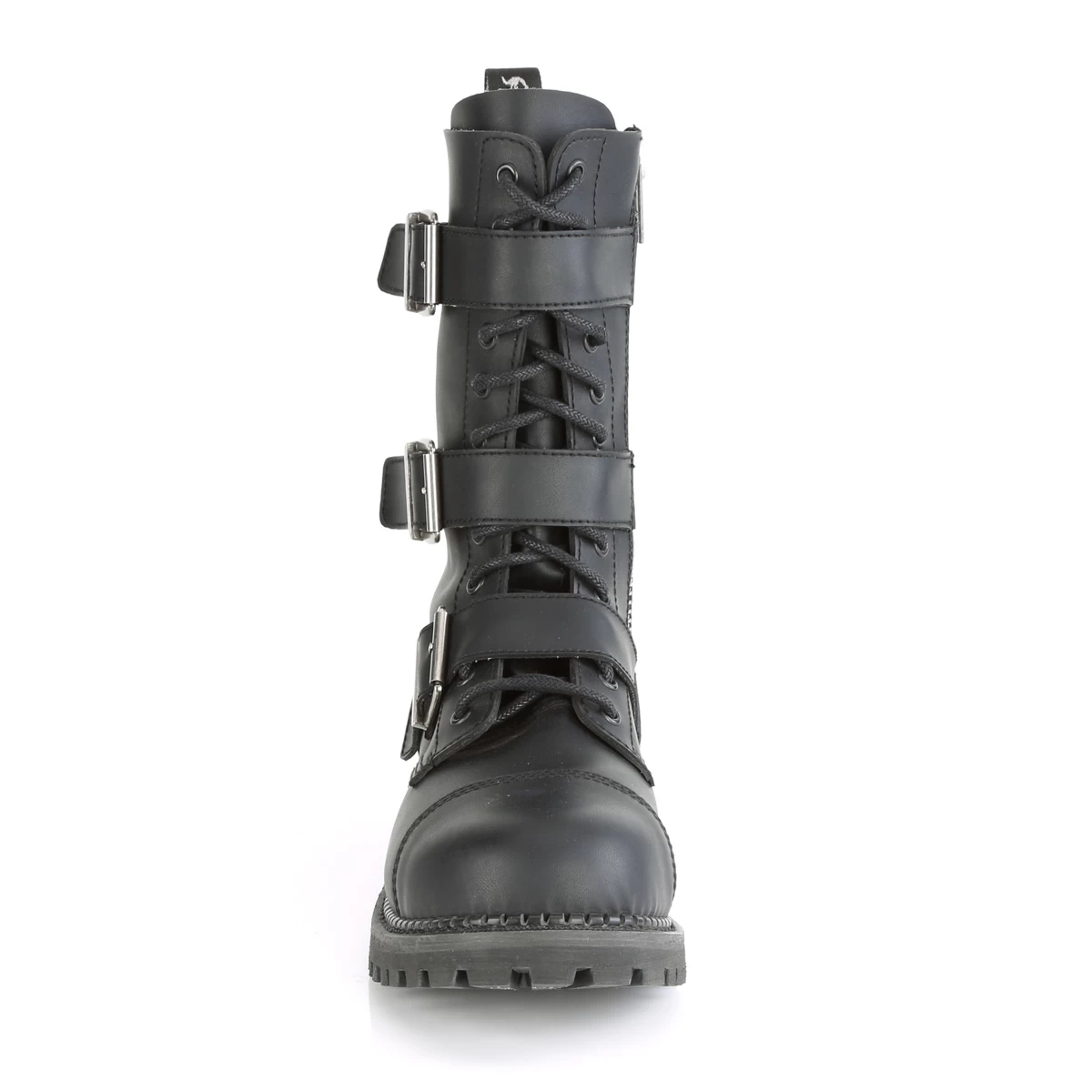Demonia 12 Eyelet Unisex Vegan Steel Toe Lace-Up Triple Buckle Ankle Boot, Rubber Sole, Full Length Inside Zip Closure