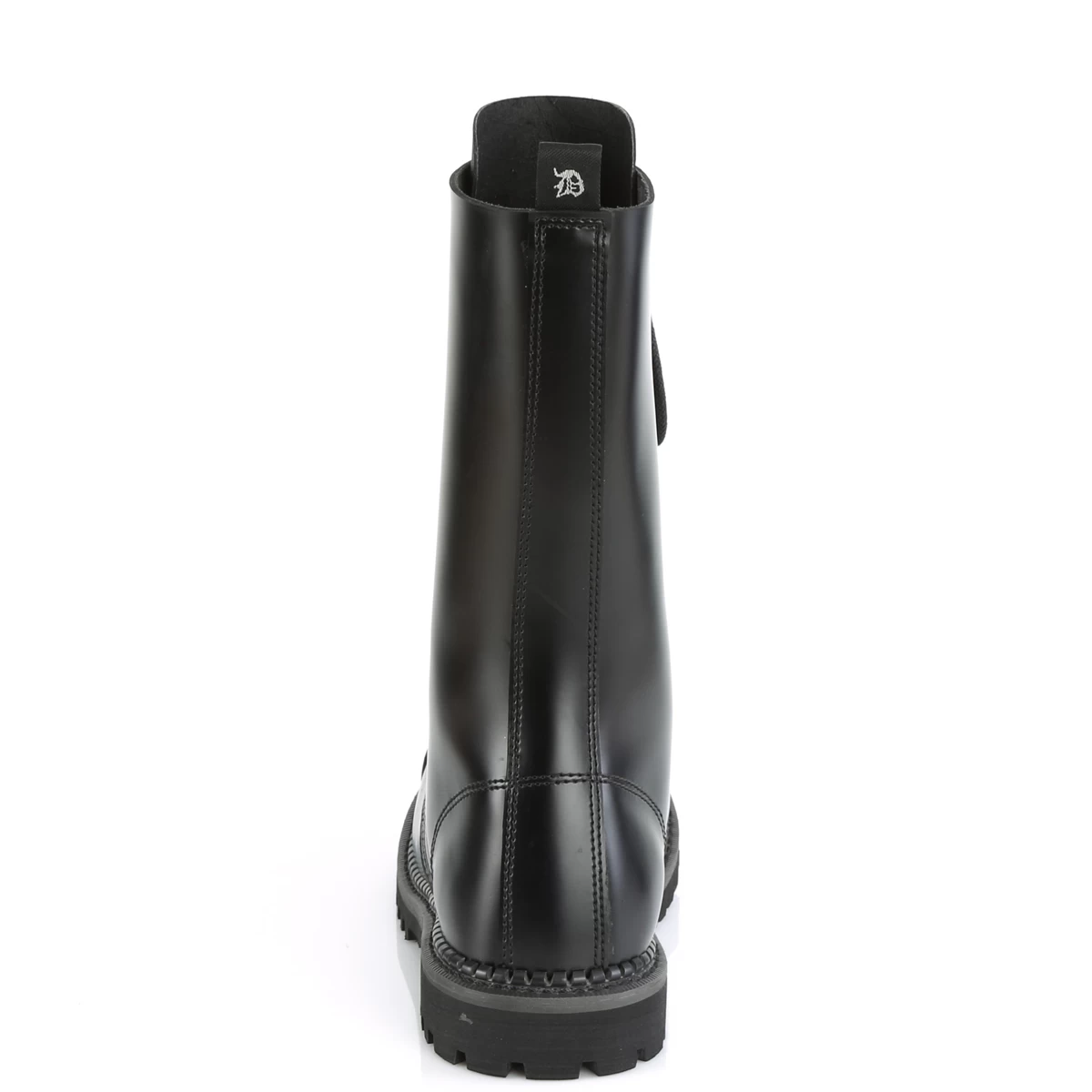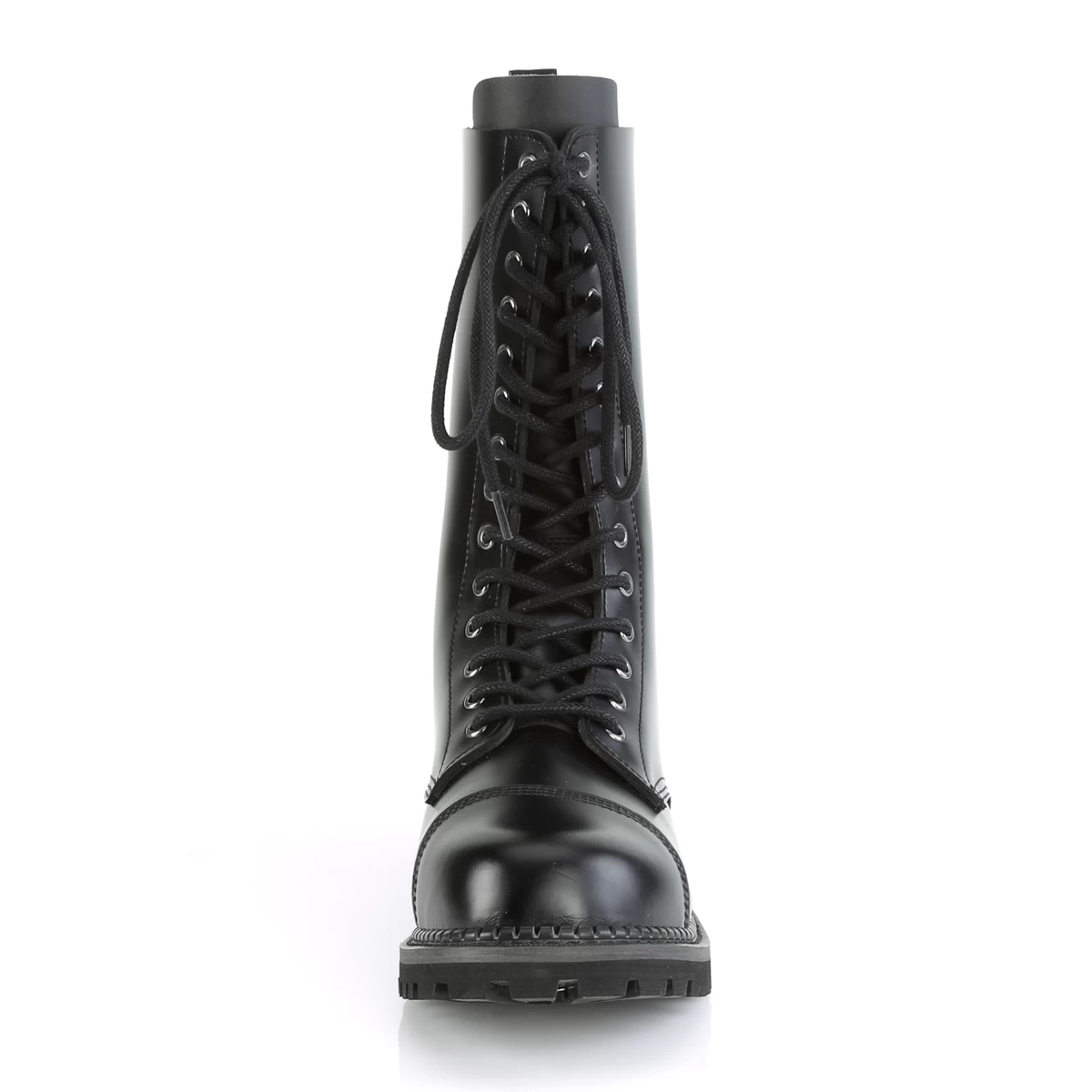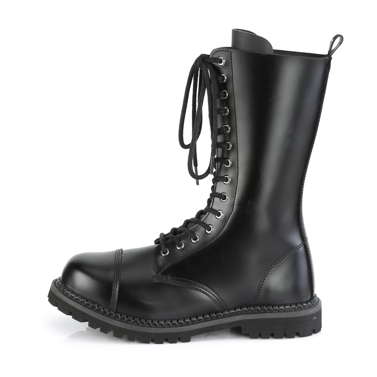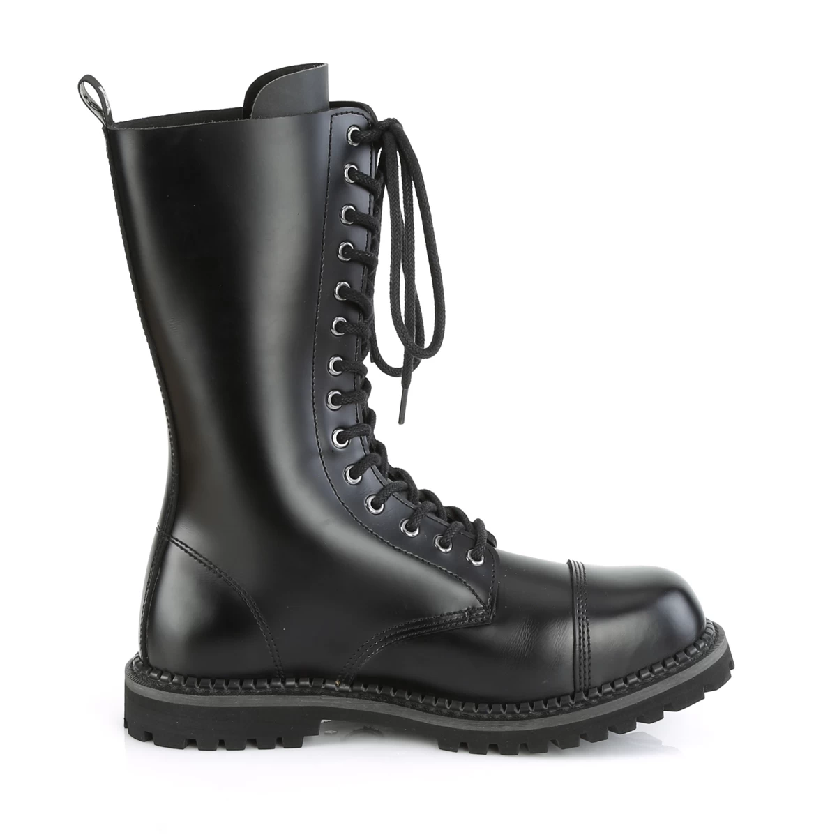 Demonia 14 Eyelet Unisex Leather Steel Toe Lace-Up Mid Calf Boot, Rubber Sole, Full Length Inside Zip Closure