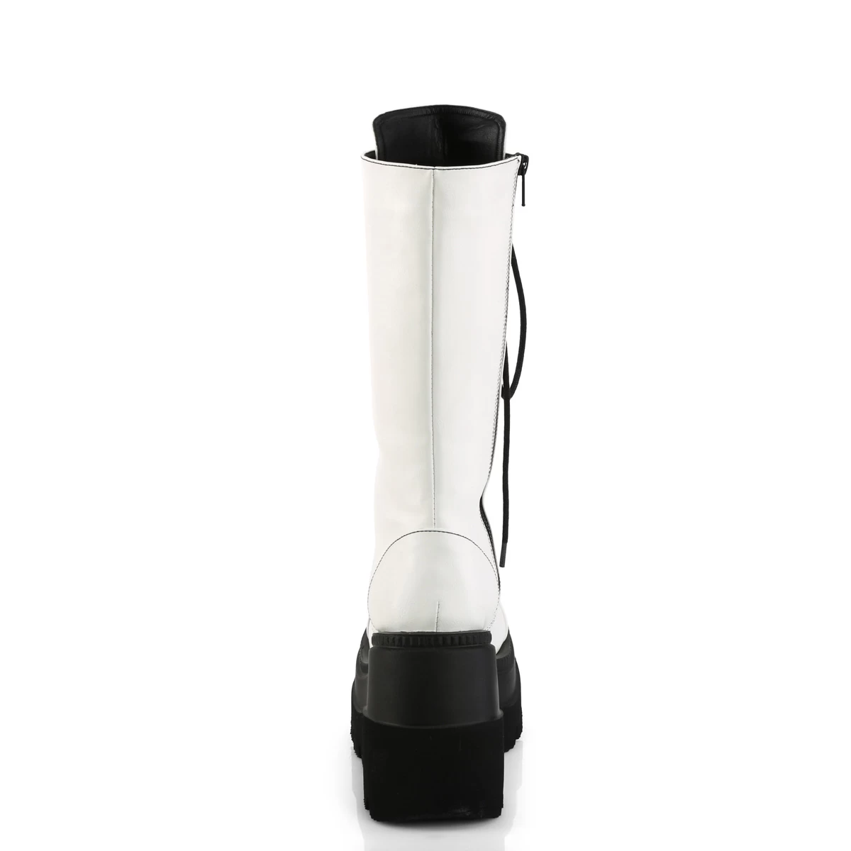 SHAKER-72 White Vegan Leather, 4 1/2″ (114mm) Wedge Platform Lace-Up Front Mid-Calf Boot, Full-Length Inner Side Zip Closure