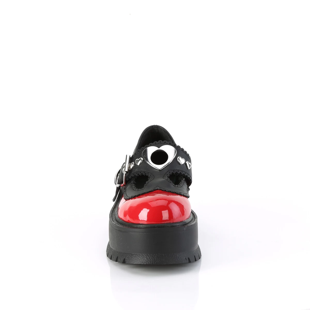 SLACKER-23 Red-Black Vegan Leather, 2″ (51mm) Platform Heart Studded T-Stap Maryjane Featurning Oversize Center Heart Eyelet & Scallop Edge Details