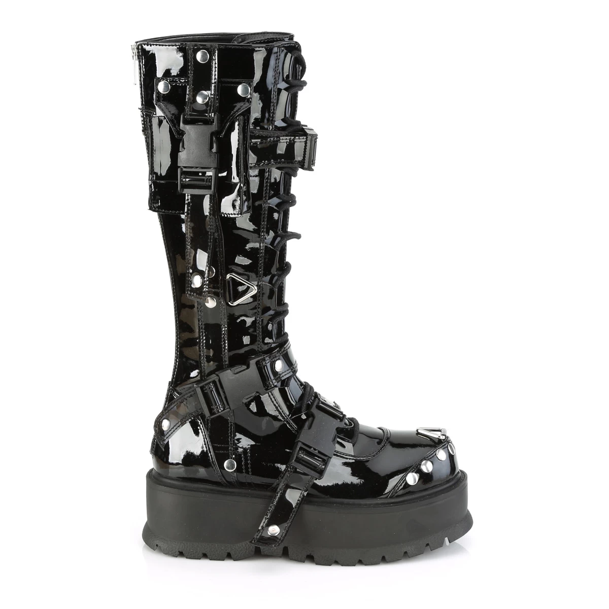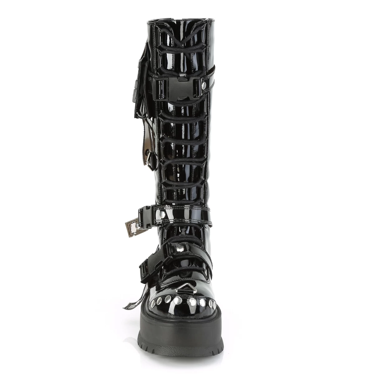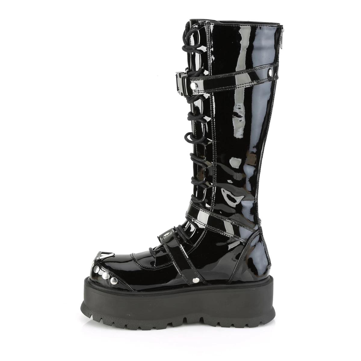 SLACKER-260 Black Pat 2″ PF Lace-Up Knee High Boot, Back Metal Zip