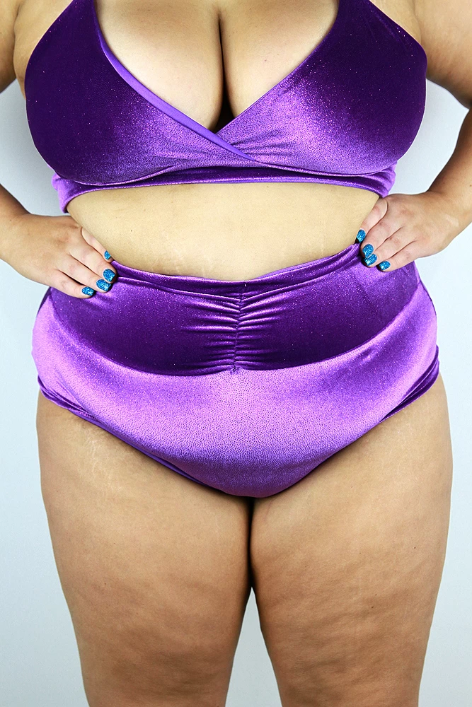 Our Velveteratti short features glittery velvet fabric, plush soft handfeel will leave you feeling super seductive! This high waisted short and has a scrunchie bum showing lots of booty. Pair it with the stunning matching bra. Perfect for all dance, photoshoots and performances.