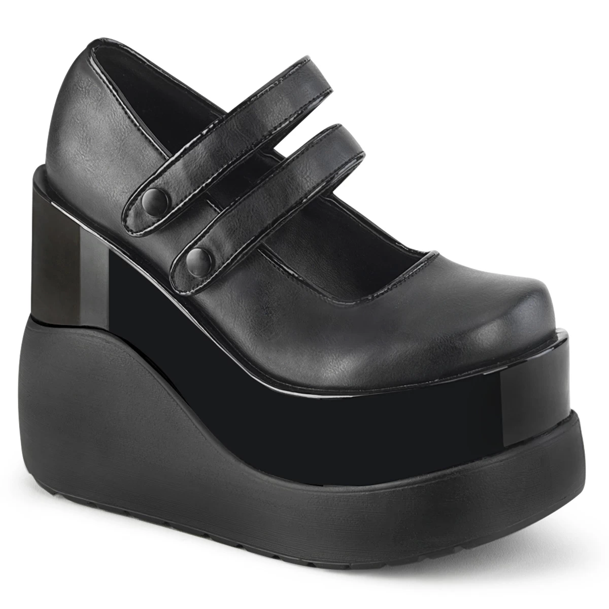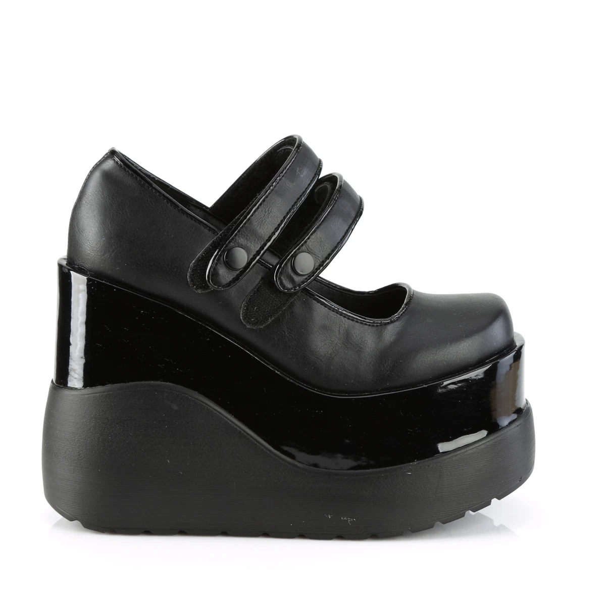 VOID-37 Black Vegan Leather-Patent, 5″ (127mm) Wedge Tiered Platform Maryjane w/ Dual Hook & Loop Straps & Button Detail